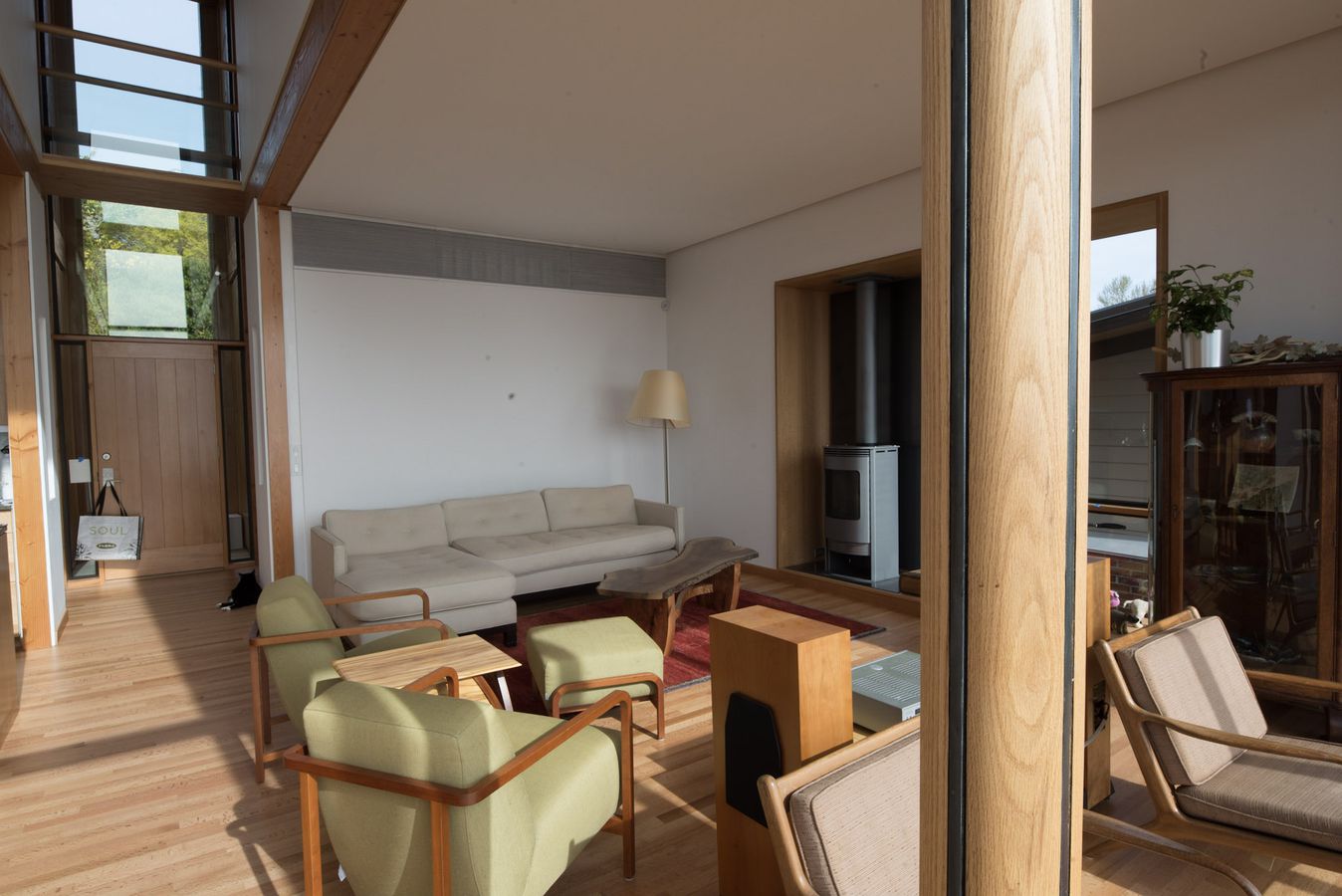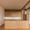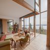 Weathering corten steel clads the exterior face of this modern urban dwelling. Inside, opposite the entrance, floor to ceiling glass reveals an expansive view of the mountains and the lake below. Interior finishes combine oak floors and cabinets with concrete counters and exposed structural elements of fir and steel.
